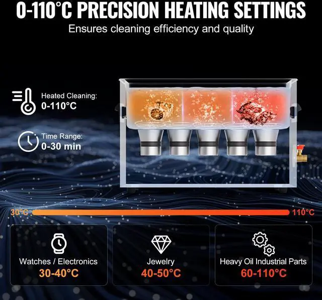Heated Cleaning: For different items such as jewelry, watches/electronic accessories, and heavy grease industrial components, you can control the cleaning temperature from 0-110°C to accelerate the dissolution of dirt. This provides more efficient and targeted cleaning results. The high-temperature mode quickly breaks down stubborn grease, while the low-temperature mode gently protects sensitive materials.