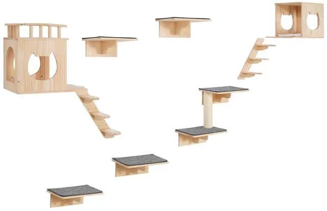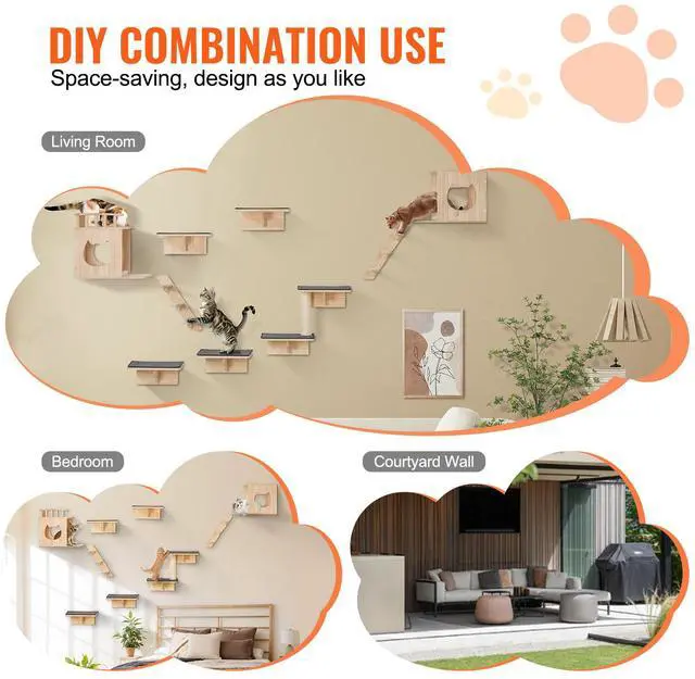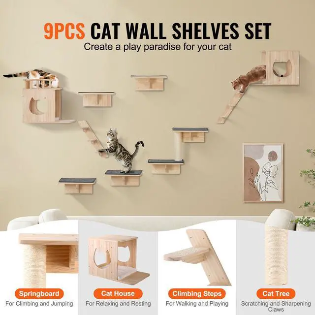 • VEVOR Wall Mounted Cat Shelves Tree with Jumping Boards Nests Hammock Set of 9