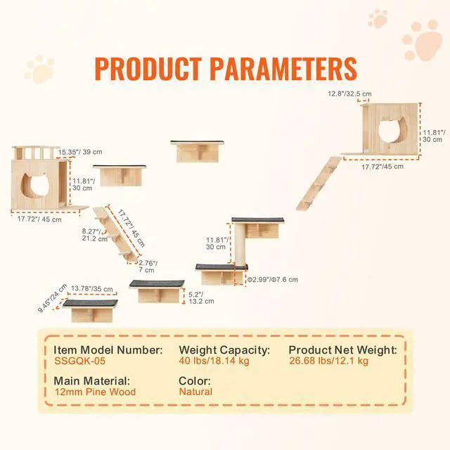 Square Cat House Size: 17.72" x 11.81" x 12.8"/45 x 30 x 32.5 cm,Weight Capacity: 40 lbs/18.14 kg,Color: Natural,Jump Platform Size: 13.78" x 9.45" x 5.2"/35 x 24 x 13.2 cm,Item Model Number: SSGQK-05,Product Net Weight: 26.68 lbs/12.1 kg,Cat House with Fence Size: 17.72" x 11.81" x 15.35"/45 x 30 x 39 cm,Stair Size: 17.72" x 8.27" x 2.76"/45 x 21.2 x 7 cm,Main Material: 12mm Pine Wood,Post Size: 2.99" x 11.81"/7.6 x 30 cm