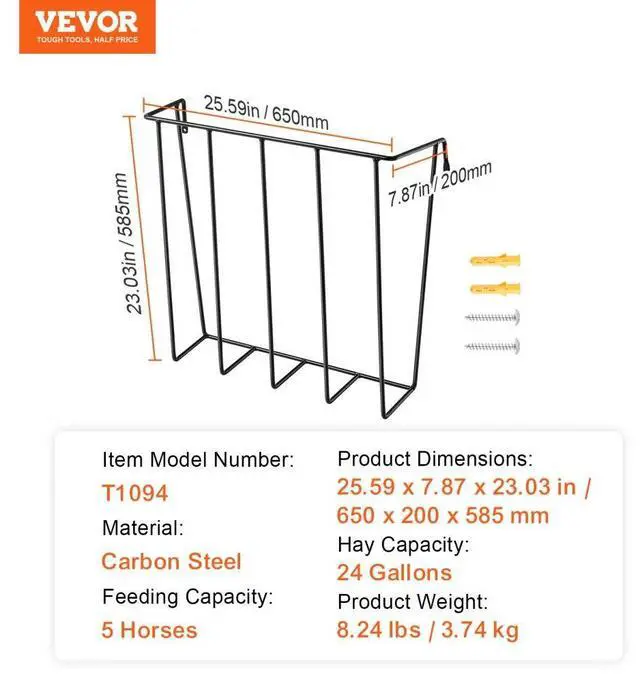 Item Model Number: T1094,Feeding Capacity: 5 Horses,Product Weight: 3.74 kg / 8.24 lbs,Dimensions: 650 x 200 x 585 mm / 25.59 x 7.87 x 23.03 in,Material: Carbon Steel,Grain Capacity: 24 Gallons