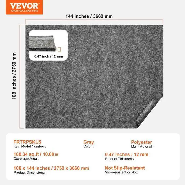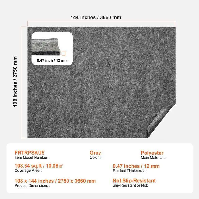 Net Weight (including all accessories): 26.46 lbs / 12 kg ±3%,Color: Gray,Item Model Number: FRTRPSKU5,Product Thickness: 0.47 inches / 12 mm (+1/-0 mm),Coverage Area: 108.34 sq.ft / 10.08,Product Dimensions: 108 x 144 inches / 2750 x 3660 mm,Main Material: Polyester