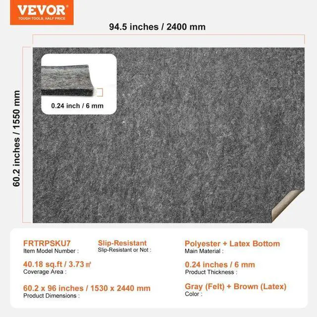 Net Weight (including all accessories): 9.04 lbs / 4.1 kg ±3%,Color: Gray (Felt) + Brown (Latex),Item Model Number: FRTRPSKU7,Product Thickness: 0.24 inches / 6 mm (+1/-0 mm),Coverage Area: 40.18 sq.ft / 3.73,Product Dimensions: 60.2 x 96 inches / 1530 x 2440 mm,Main Material: Polyester + Latex Bottom