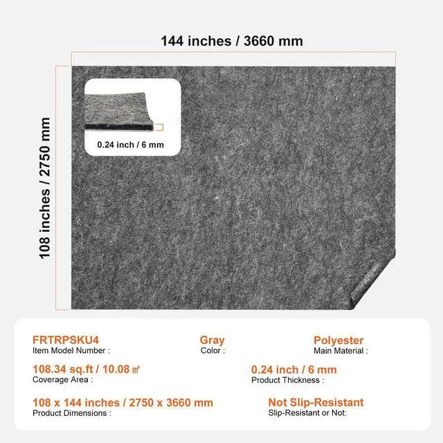 Net Weight (including all accessories): 15.43 lbs / 7 kg ±3%,Color: Gray,Item Model Number: FRTRPSKU4,Product Thickness: 0.24 inches / 6 mm (+1/-0 mm),Coverage Area: 108.34 sq.ft / 10.08,Product Dimensions: 108 x 144 inches / 2750 x 3660 mm,Main Material: Polyester