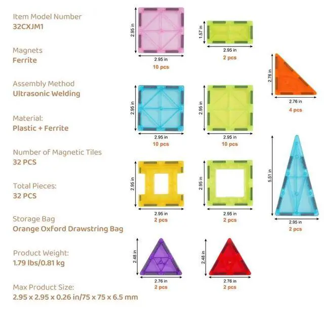 Item Model Number: 32CXJM1,Product Weight: 1.79 lbs/0.81 kg,Max Product Size: 2.95 x 2.95 x 0.26 in/75 x 75 x 6.5 mm,Number of Magnetic Tiles: 32 PCS,Material: Plastic + Ferrite,Total Pieces: 32 PCS,Magnets: Ferrite,Assembly Method: Ultrasonic Welding,Storage Bag: Orange Oxford Drawstring Bag