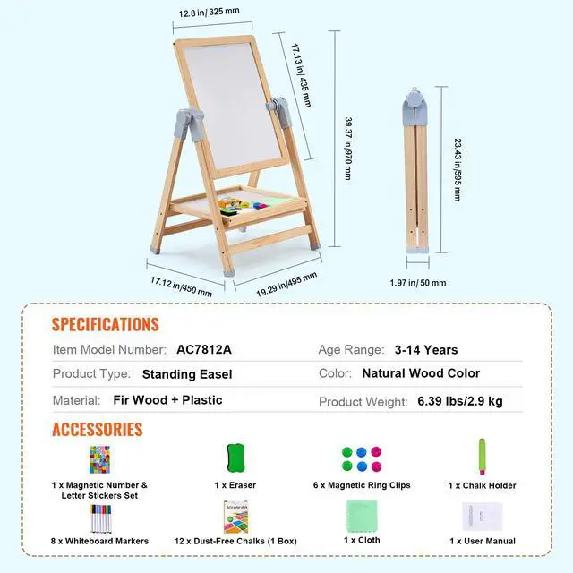 Product Type: Standing Easel,Age Range: 3-14 Years,Color: Natural Wood Color,Item Model Number: AC7812A,Product Weight: 6.39 lbs/2.9 kg,Material: Fir Wood + Plastic