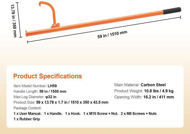 Handle Length: 59 in / 1500 mm,Opening Width: 16.2 in / 411 mm,Item Model Number: LH59,Product Weight: 10.8 lbs / 4.9 kg,Max Log Diameter: 32 in,Main Material: Carbon Steel,Product Size: 59 x 13.78 x 17.13 in / 1510 x 350 x 435 mm