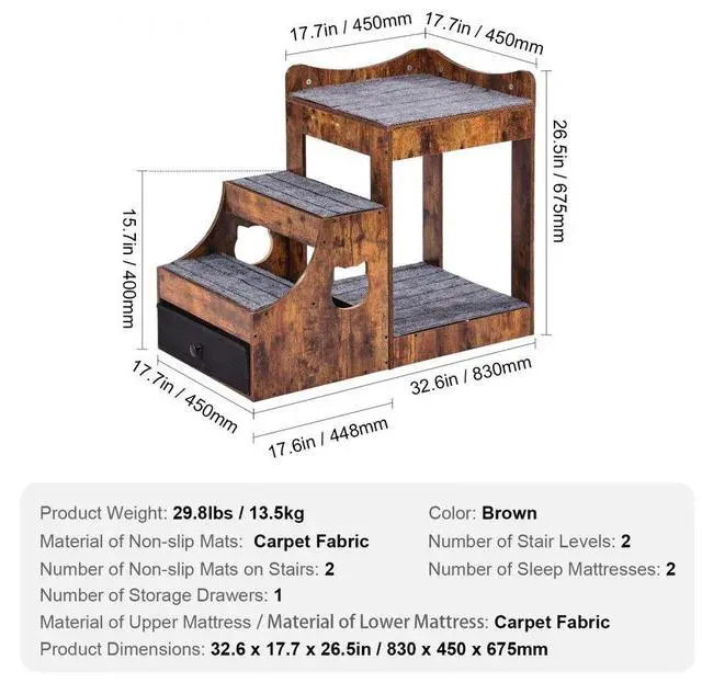 Material of Lower Mattress: Carpet Fabric,Number of Sleep Mattresses: 2,Number of Stair Levels:2,Material of Non-slip Mats: Carpet Fabric,Color:Brown,Item Model Number: LT-MKT01,Product Weight:29.8lbs / 13.5kg,Specification: Small,Product Dimensions (L x W x H):32.6x17.7x26.5in / 830x450x675mm,Number of Non-slip Mats on Stairs:3,Number of Storage Drawers: 1,Material of Upper Mattress: Carpet Fabric
