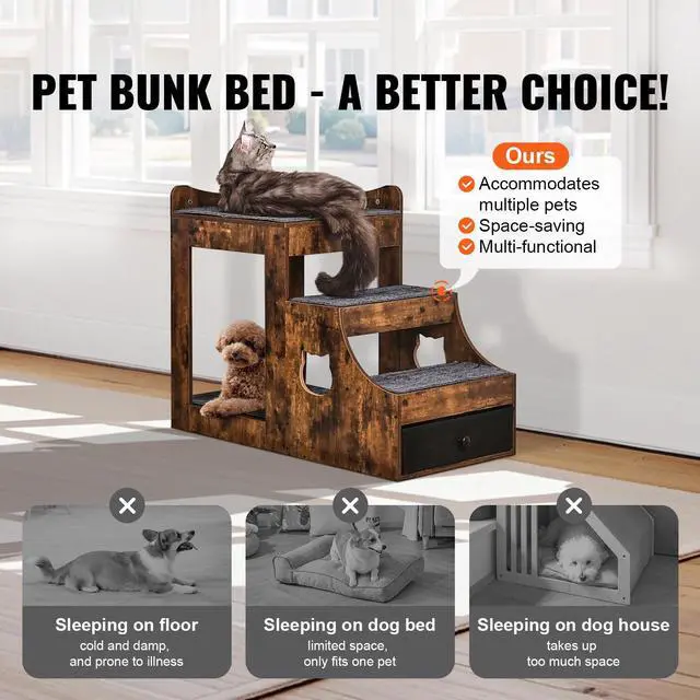 VEVOR Pet Bunk Bed with Stairs Dog/Cat Window Perch with Storage Indoor Brown