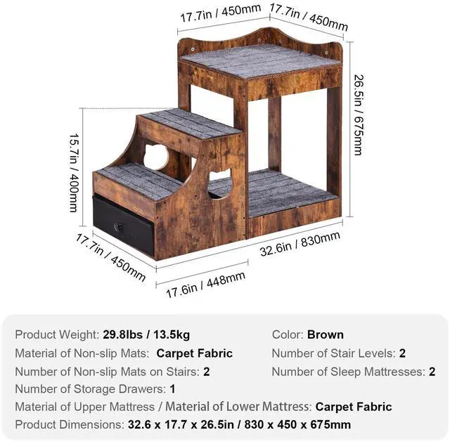 Material of Lower Mattress: Carpet Fabric,Number of Sleep Mattresses: 2,Number of Stair Levels:2,Material of Non-slip Mats: Carpet Fabric,Color:Brown,Item Model Number: LT-MKT01,Product Weight:29.8lbs / 13.5kg,Specification: Small,Product Dimensions (L x W x H):32.6x17.7x26.5in / 830x450x675mm,Number of Non-slip Mats on Stairs:3,Number of Storage Drawers: 1,Material of Upper Mattress: Carpet Fabric