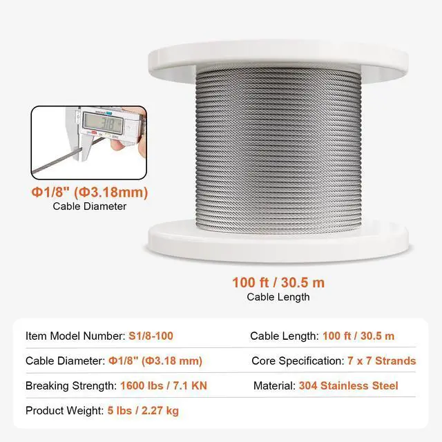 Breaking Strength: 1600 lbs/7.1KN,Item Model Number: S1/8-100,Product Weight: 5 lbs/2.27 kg,Cable Diameter: 1/8" (3.18 mm),Cable Length: 100 ft/30.5 m,Material: 304 Stainless Steel,Core Specification: 7 x 7 Strands