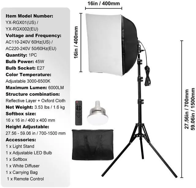Bulb Power: 45W,Structure combination: Reflective Layer + Oxford Cloth,Voltage and Frequency: AC110-240V 60Hz(US),Color Temperature: Adjustable 3000-6500K,Bulb Socket: E27,Item Model Number: YX-RGX01(US),Quantity: 1PC,Overall Size: 16 x 16 x 6 in / 400 × 400 x 150 mm,Maximum Lumen: 6000LM,Net Weight: 3.53 lbs / 1.6 kg,Softbox Size: 16 x 16 in / 400 x 400 mm