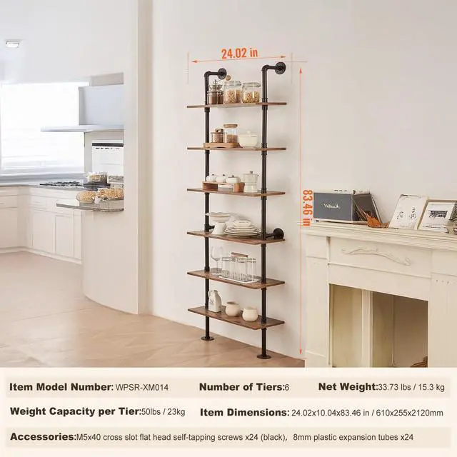 Suspension rod: no,Round tube size: 25±1 x 1.2±0.1mm,Number of layers: 6,Color wood board: vintage color round tube: black,Specification: 24 x 9.84 x 82.68in (610±5 x 250±5 x 2100±10mm),Board size: 610±5 x 250±5 x 15±2 mm,Layer height: 300mm,Item Model Number: WPSR-XM014,Load capacity per layer: 50lbs / 23kg,Item Dimensions: 24.02 x 10.04 x 83.46 in / 610 x 255 x 2120 mm,Net Weight: 33.73 lbs / 15.3 kg,Main Material: P2 density board ,Steel (galvanized),Inner width: 465mm