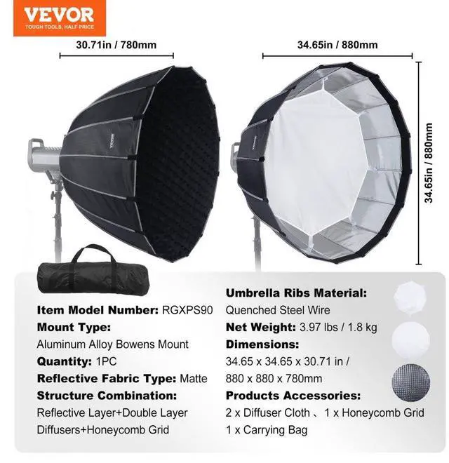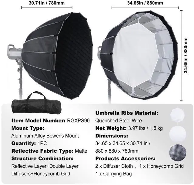 Reflective Fabric Type: Matte,Umbrella Ribs Material: Quenched Steel Wire,Mount Type: Aluminum Bowens Mount,Item Model Number: RGXPS90,Quantity: 1PC,Dimensions: 34.65 x 34.65 x 30.71 in / 880 x 880 x 780mm,Net Weight: 3.97 lbs / 1.8 kg,Structure Combination: Reflective Layer+2 Layers of Diffusers+Honeycomb Grid