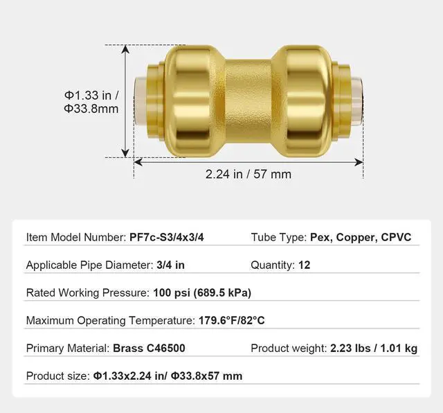 Primary Material: Brass C46500,Rated Working Pressure: 100 psi (689.5 kPa),Tube Type: Pex, Copper, CPVC,Product weight: 2.23 lbs / 1.01 kg,Item Model Number: PF7c-S3/4x3/4,Quantity: 12,Maximum Operating Temperature: 179.6°F/82°C,Applicable Pipe Diameter: 3/4 in,Product size: 1.33x2.24 in/ 33.8x57 mm