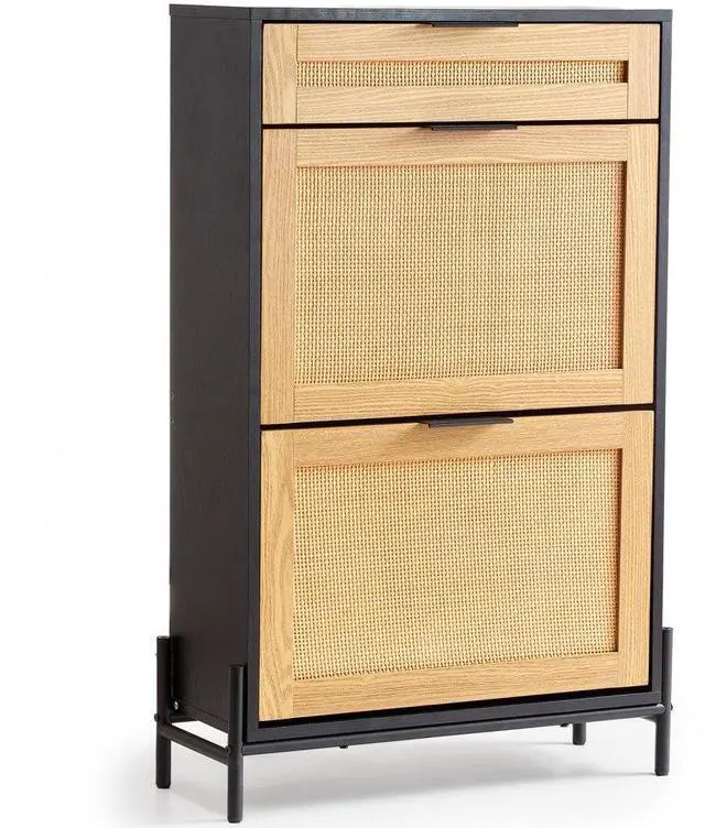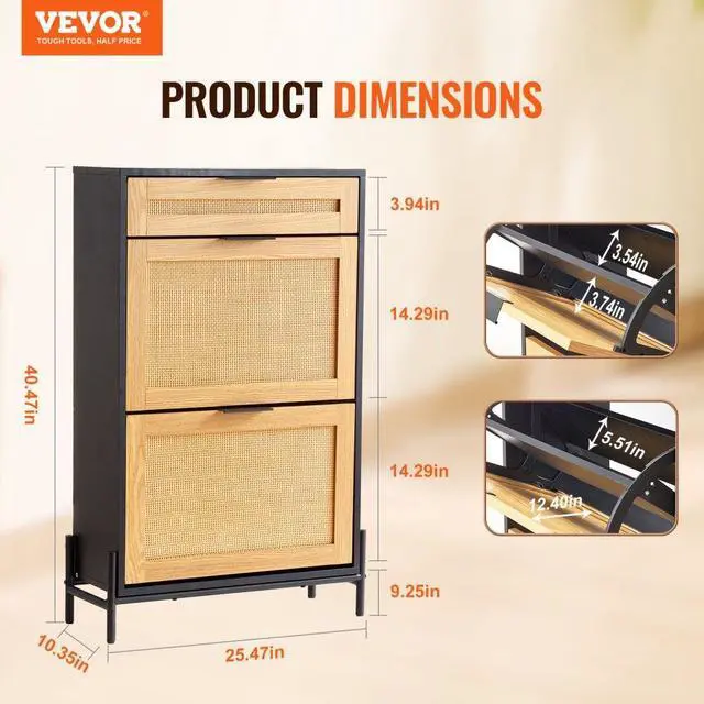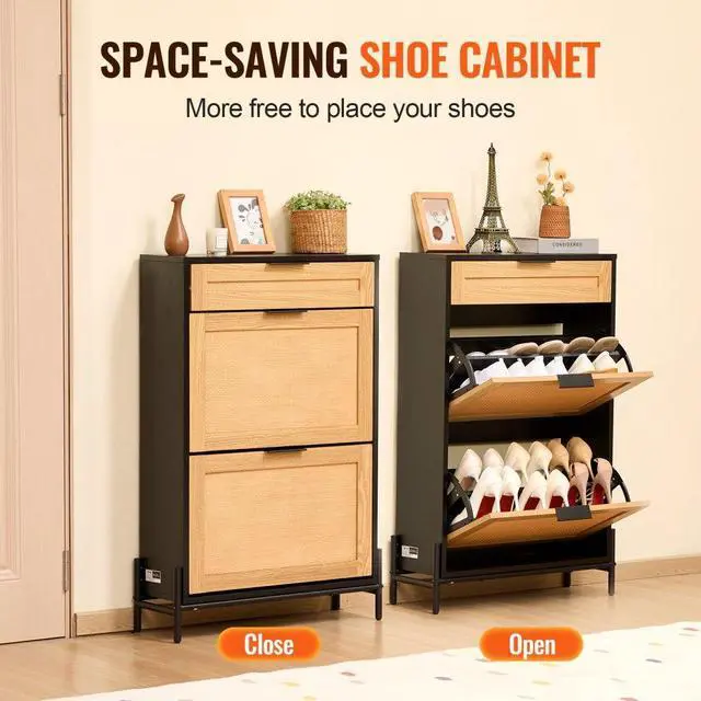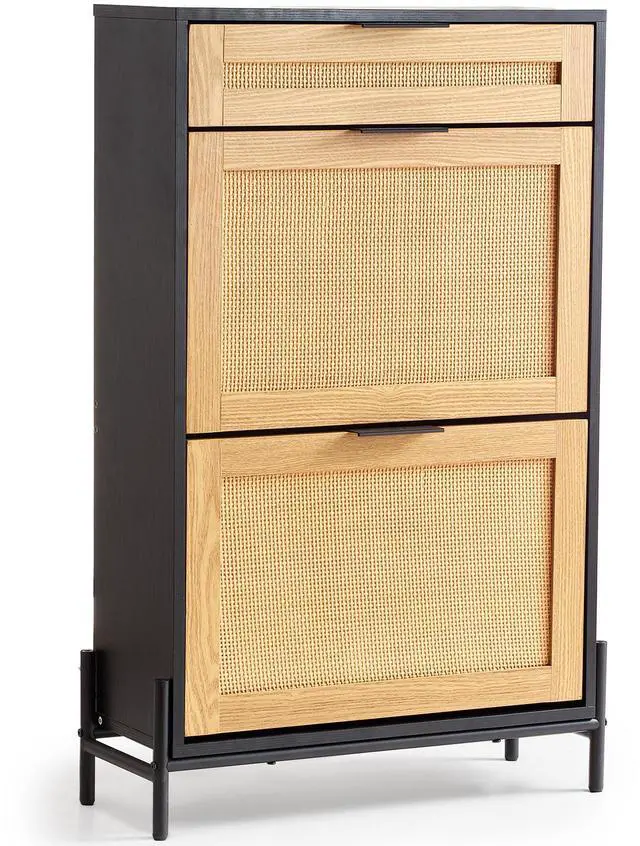 VEVOR Rattan Shoe Cabinet, Narrow Shoe Storage Organizer with 2 Flip Rattan Drawers & 1 Slide Drawer, Metal Legs, Slim Shoe Entryway Cabinet Ideal for Entryway, Closet, Hallway, Black