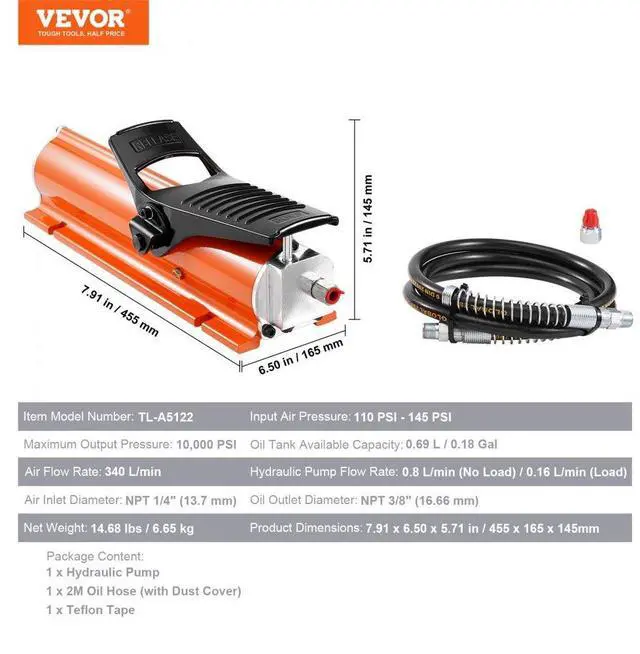 Input Air Pressure: 110 PSI - 145 PSI,Oil Tank Available Capacity: 0.69 L / 0.18 Gal,Air Inlet Diameter: NPT 1/4" (13.7 mm),Oil Outlet Diameter: NPT 3/8" (16.66 mm),Air Flow Rate: 340 L/min,Item Model Number: TL-A5122,Hydraulic Pump Flow Rate: 0.8 L/min (No Load) / 0.16 L/min (Load),Maximum Output Pressure: 10,000 PSI,Product Dimensions: 7.91 x 6.50 x 5.71 in / 455 x 165 x 145mm,Net Weight: 14.68 lbs / 6.65 kg