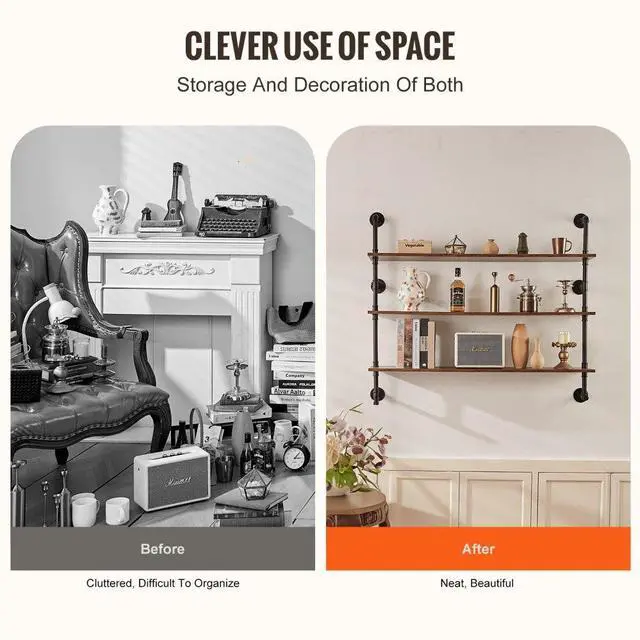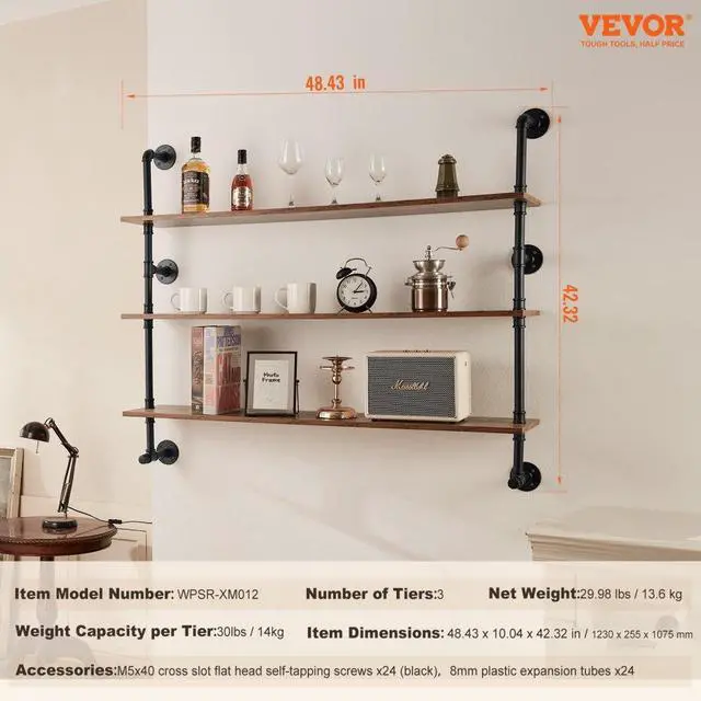 VEVOR Industrial Pipe Shelf 3 Tier 48x9.84in Wall-Mount for Kitchen Bedroom