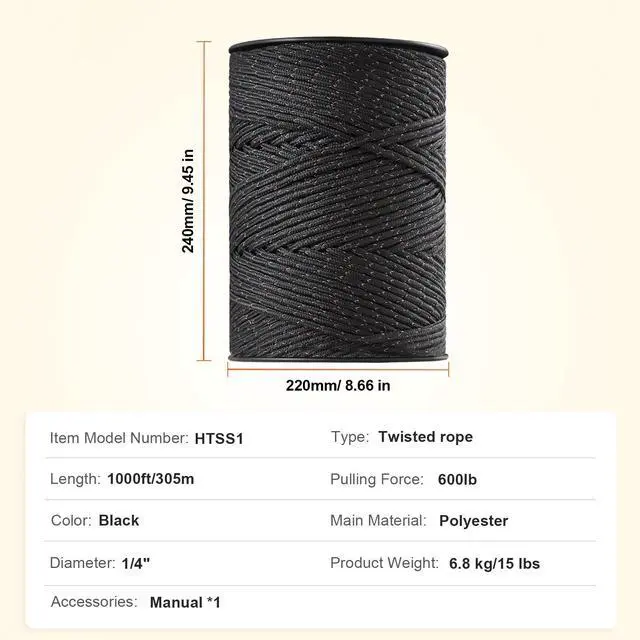 Pulling Force: 600lb,Length: 1000ft/305m,Color: Black,Item Model Number: HTSS1,Product Weight: 6.8 kg/15 lbs,Main Material: Polyester