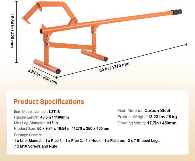 Handle Length: 46.5 in / 1180 mm,Opening Width: 17.7 in / 450 mm,Item Model Number:L2T48,Product Weight: 13.23 lbs / 6 kg,Max Log Diameter: 15 in,Main Material: Carbon Steel,Product Size: 50 x 9.84 x 16.54 in / 1270 x 250 x 420 mm