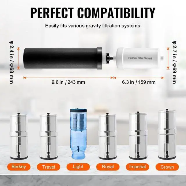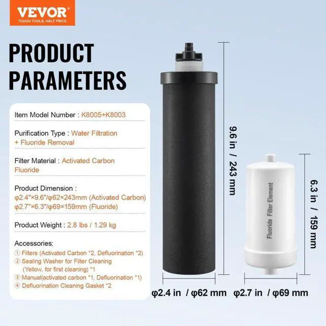 Item Model Number: K8005 + K8003,Product Weight: 2.8 lbs / 1.29 kg,Filter Material: Activated Carbon, Fluoride,Activated Carbon Dimension: 2.4"x9.6" / 62x243mm,Fluoride Dimension: 2.7"x6.3" / 69x159mm,Purification Type: Water Filtration + Fluoride Removal