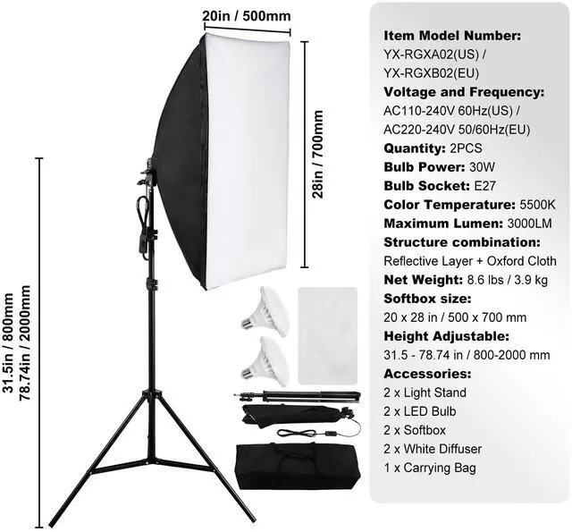 Bulb Power: 30W,Structure combination: Reflective Layer + Oxford Cloth,Overall size: 20 x 28 x 8 in / 500 x 700 x 200 mm,Voltage and Frequency: AC110-240V 60Hz(US),Color Temperature: 5500K,Bulb Socket: E27,Item Model Number: YX-RGXA02(US),Quantity: 2PCS,Softbox size: 20 x 28 in / 500 x 700 mm,Maximum Lumen: 3000LM,Net Weight: 8.6 lbs / 3.9 kg