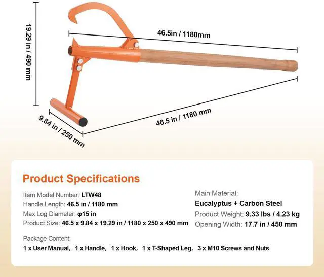 Handle Length: 46.5 in / 1180 mm,Opening Width: 17.7 in / 450 mm,Item Model Number: LTW48,Product Weight: 9.33 lbs / 4.23 kg,Max Log Diameter: 15 in,Main Material: Ash Wood + Carbon Steel,Product Size: 46.5 x 9.84 x 19.29 in / 1180 x 250 x 490 mm