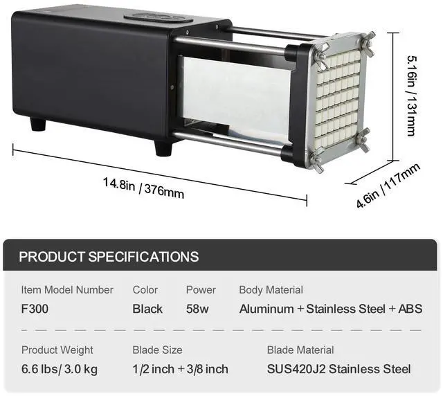 Blade Material: SUS420J2 Stainless Steel,Body Material: Aluminum + Stainless Steel + ABS,Color: Black,Item Model Number: F300,Product Weight: 6.6 lbs/ 3.0 kg,Blade Size: 1/2 inch + 3/8 inch,Power: 58w,Product Size: 14.8 x 4.6 x 5.16 inches / 376 x 117 x 131 mm