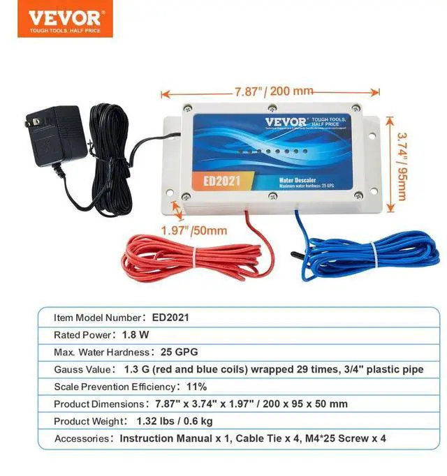Scale Prevention Efficiency: 11%,Item Model Number: ED2021,Product Weight: 1.32 lbs / 0.6 kg,Max. Water Hardness: 25 GPG,Rated Power: 1.8 W,Gauss Value: 1.3 G (red and blue coils) wrapped 29 times, 3/4" plastic pipe,Product Dimensions: 7.87" x 3.74" x 1.97" / 200 x 95 x 50 mm
