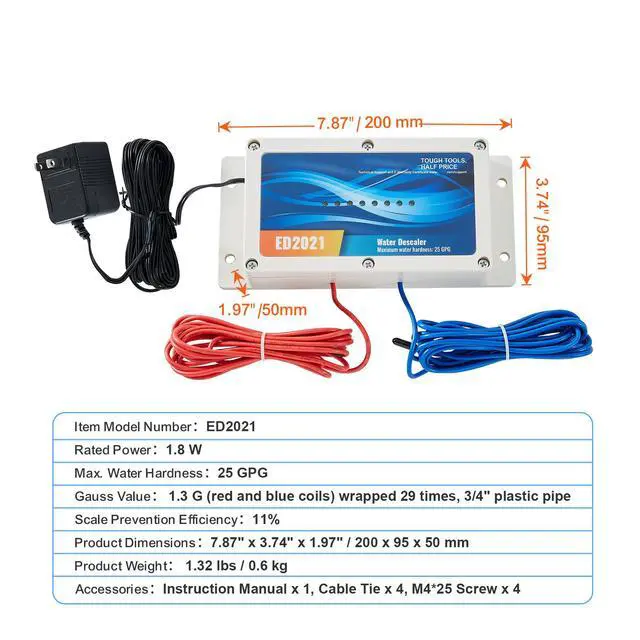 Scale Prevention Efficiency: 11%,Item Model Number: ED2021,Product Weight: 1.32 lbs / 0.6 kg,Max. Water Hardness: 25 GPG,Rated Power: 1.8 W,Gauss Value: 1.3 G (red and blue coils) wrapped 29 times, 3/4" plastic pipe,Product Dimensions: 7.87" x 3.74" x 1.97" / 200 x 95 x 50 mm