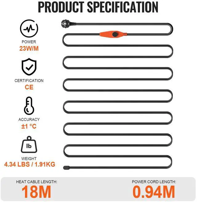 Heat Cable Length: 60FT,Power Cord Length: 3 FT,Accuracy: ±1°C,Item Model Number: PFPC1-1A060,Product Weight: 3.7 lbs / 1.7 kg,Temp. of Cable on: 415,Temp. of Cable off: 64.418