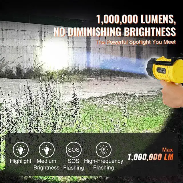 Rechargeable Cordless Spotlight: Experience the brilliance of our portable, cordless spotlight! With an astounding 1,000,000 lumens and an impressive 440-meter beam distance, this LED spotlight flashlight is your ideal companion for outdoor adventures, emergencies, and everything in between.