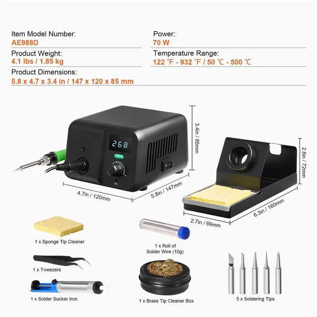 Item Model Number: AE988D,Product Weight: 4.1 lbs / 1.85 kg,Temperature Range: 122 - 932 / 50 - 500 ,Product Dimensions: 7.7 x 6.3 x 4.3 in / 195 x 160 x 110 mm,Power: 70 W