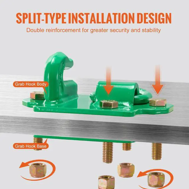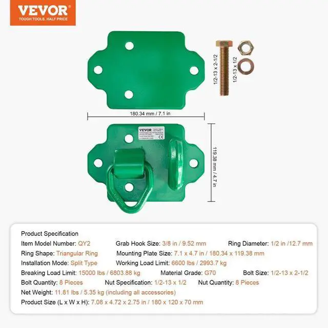 Nut Quantity: 8 Pieces,Bolt Size: 1/2-13 x 2-1/2,Ring Shape: Triangular Ring,Mounting Plate Size: 7.1" x 4.7"/180.34 x 119.38 mm,Nut Specification: 1/2-13 x 1/2,Installation Mode: Split Type,Breaking Load Limit: 15000 lbs/6803.88 kg,Product Size (L x W x H): 7.08" x 4.72" x 2.75"/180 x 120 x 70 m,Ring Diameter: 1/2"/12.7 mm,Grab Hook Size: 3/8"/9.52 mm,Bolt Quantity: 8 Pieces,Item Model Number: QY2,Material Grade: G70,Net Weight: 11.81 lbs /5.35 kg(including all accessories),Working Load Limit: 6600 lbs/2993.7 kg