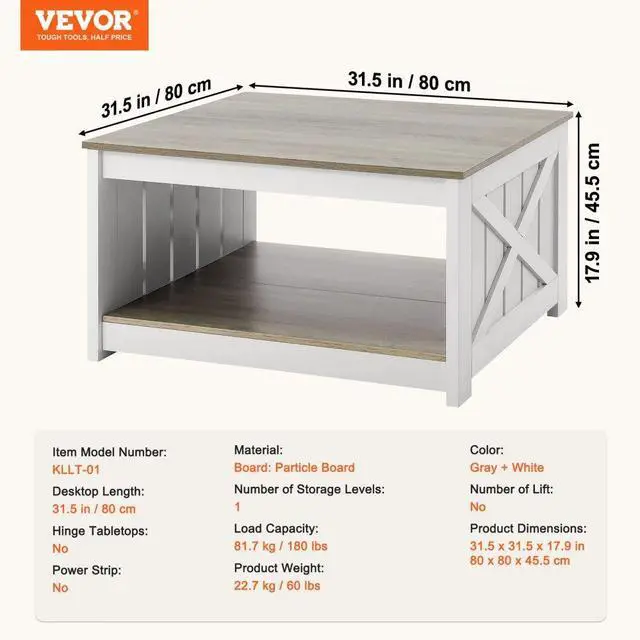 Power Strip: No,Number of Lift/Hinge Tabletops: No,Number of Storage Levels: 1,Load Capacity: 81.7 kg / 180 lbs,Maximum Height of Lift-Top Table: No,Color: Gray + White,Item Model Number: KLLT-01,Product Weight: 22.7 kg / 60 lbs,Desktop Length: 800 mm / 31.5 inches,Material: Board: Particle Board,Product Dimensions: 800 x 800 x 455 mm / 31.5 x 31.5 x 17.9 inches
