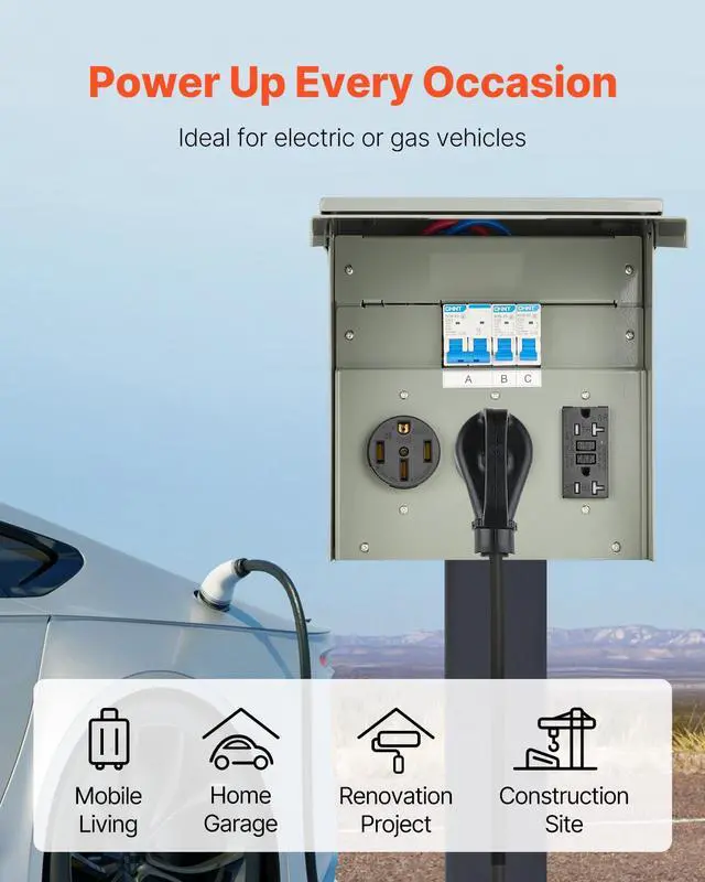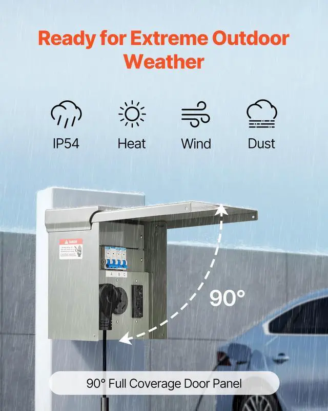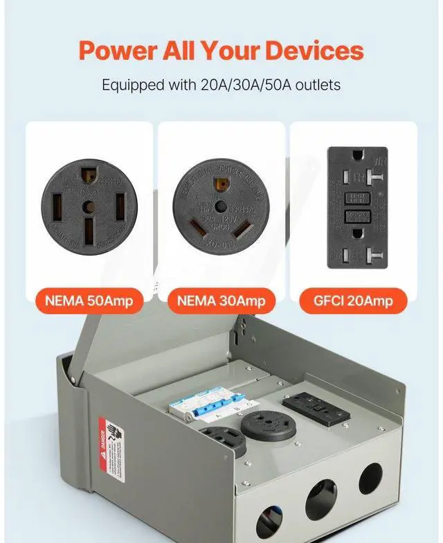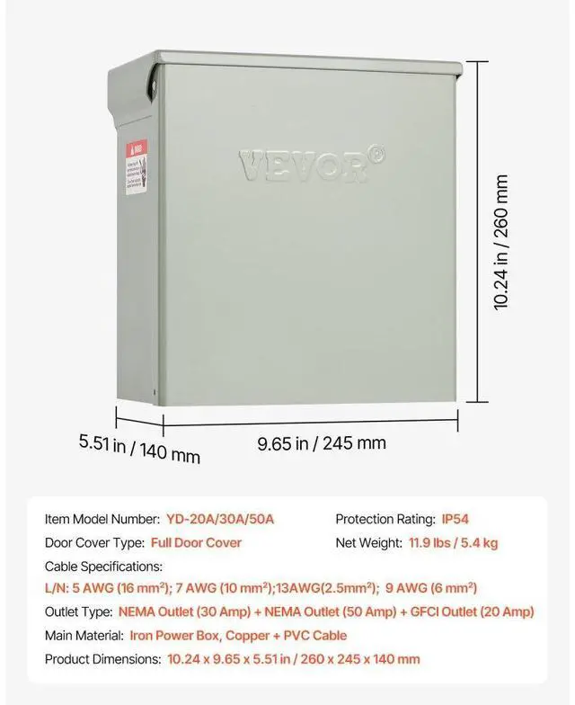 Protection Rating: IP54,Item Model Number: YD-20A/30A/50A,Door Cover Type: Full Door Cover,Cable Specifications: L/N: 5 AWG (16 mm²); 7 AWG (10 mm²); 9 AWG (6 mm²),Outlet Type: NEMA Outlet (30 Amp) + NEMA Outlet (50 Amp) + GFCI Outlet (20 Amp),Product Dimensions: 10.24 x 9.65 x 5.51 in / 260 x 245 x 140 mm,Net Weight: 11.9 lbs / 5.4 kg,Main Material: Iron Power Box, Copper + PVC Cable