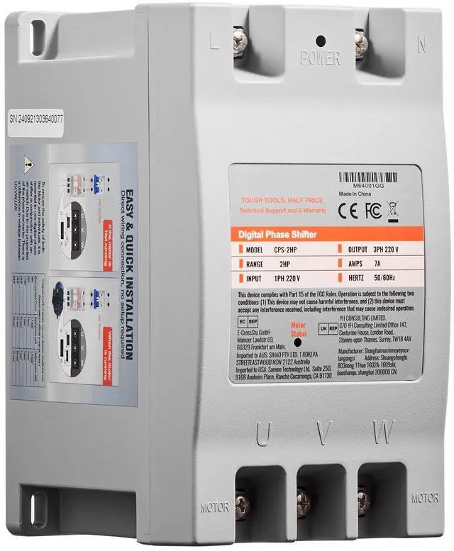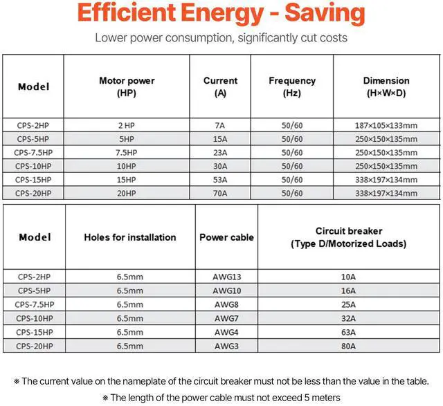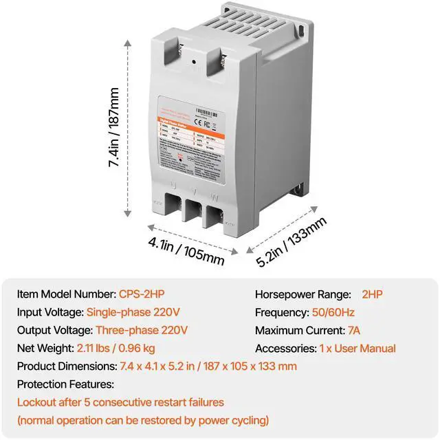Maximum Current: 7A,Item Model Number: CPS-2HP,Frequency: 50/60Hz,Input Voltage: Single-phase 220 - 240V,Horsepower Range: 1 - 2HP (1.5KW),Product Dimensions: 7.4 x 4.1 x 5.2 in / 187 x 105 x 133 mm,Output Voltage: Three-phase 220 - 240V,Net Weight: 2.11 lbs / 0.96 kg
