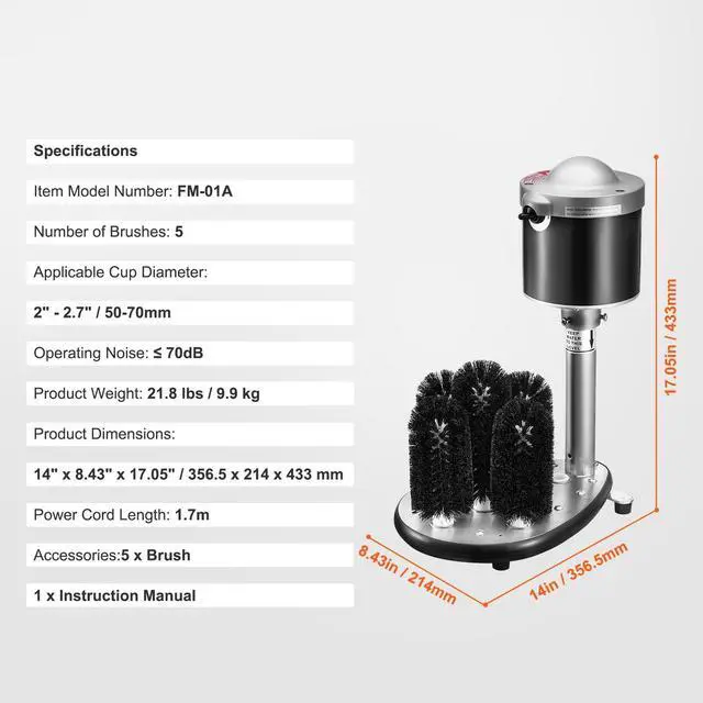 Operating Noise: 70dB,Applicable Cup Diameter: 2" - 2.7" / 50-70mm,Item Model Number: FM-01A,Product Weight: 21.8 lbs / 9.9 kg,Number of Brushes: 5,Product Dimensions: 14" x 8.43" x 17.05" / 356.5 x 214 x 433 mm