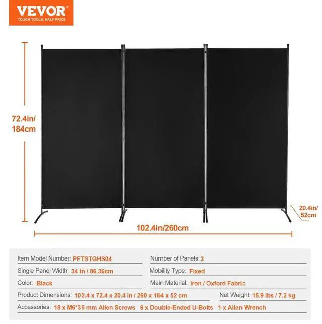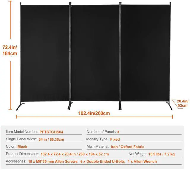 Mobility Type: Fixed,Single Panel Width: 34 in / 863.6 mm,Number of Panels: 3,Color: Black,Item Model Number: PFTSTGHS04,Product Dimensions: 102.4 x 72.4 x 20.4 in / 2600 x 1840 x 520 mm,Net Weight: 15.9 lbs / 7.2 kg,Main Material: Iron / Oxford Fabric