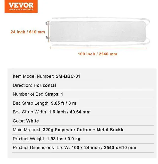 Number of Bed Straps: 1,Color: White,Item Model Number: SM-BBC-01,Product Weight: 1.98 lbs / 0.9 kg,Bed Strap Width: 1.6 inch / 40.64 mm,Bed Strap Length: 9.85 ft / 3 m,Product Dimensions: L x W: 100 x 24 inch / 2540 x 610 mm,Direction: Horizontal,Main Material: 320g Polyester Cotton + Metal Buckle