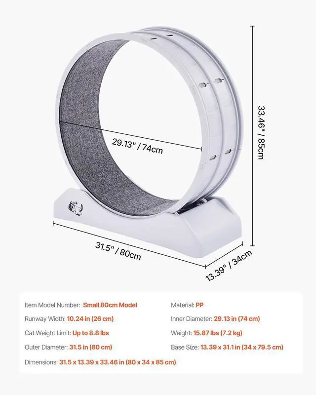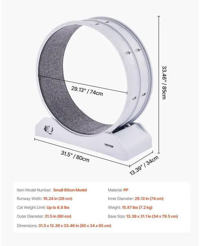 Outer Diameter: 31.5 in (800 mm),Base Dimensions (W x L): 13.39 x 31.1 in (340 x 795 mm),Suitable Cat Weight: Up to 8.8 lbs,Inner Diameter: 29.13 in (740 mm),Item Model Number: Small 80cm Model,Product Weight: 15.87 lbs (7.2 kg),Material: PP,Product Dimensions: 31.5 x 13.39 x 33.46 in (800 x 340 x 850 mm),Runway Width: 10.24 in (260 mm)
