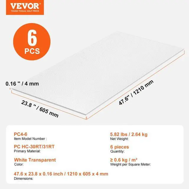 Primary Material: PC HC-30RT/31RT,Color: White Transparent,Item Model Number: PC4-6,Weight per Square Meter: 0.6 kg / m²,Dimensions: 47.6 x 23.8 x 0.16 inches / 1210 x 605 x 4 mm,Quantity: 6 pieces,Net Weight: 5.8 lbs / 2.64 kg