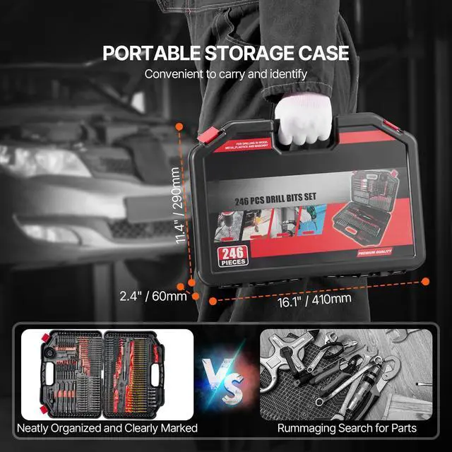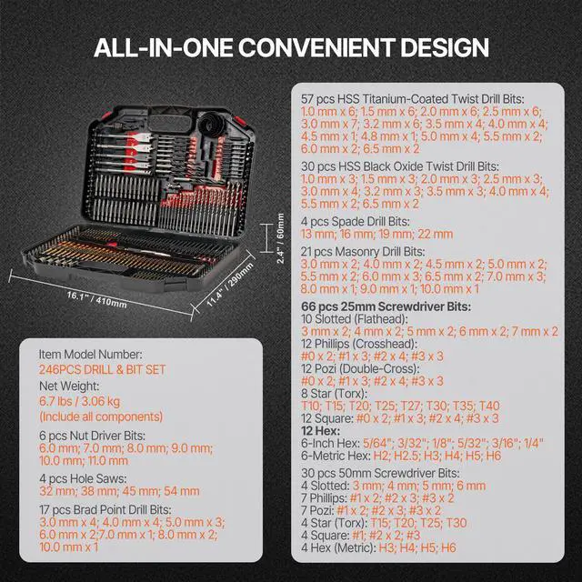 Item Model Number: 246PCS DRILL & BIT SET,Storage Case Size: 16.1" x 11.4" x 2.4" / 410 x 290 x 60 mm,Net Weight: 6.7 lbs / 3.06 kg (Include all components)