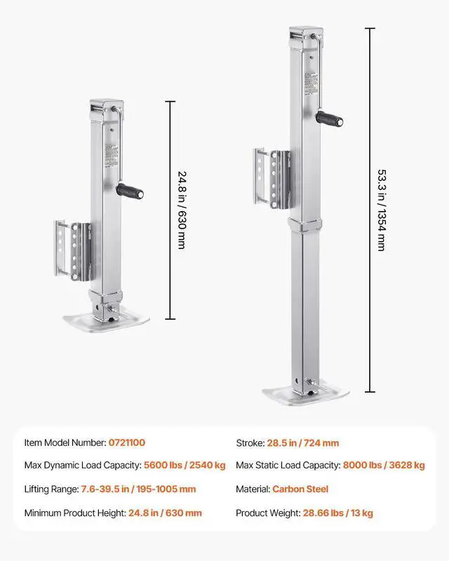 Stroke: 28.5 in/724 mm,Item Model Number: 721100,Max Static Load Capacity: 8000 lbs/3628 kg,Product Weight: 28.66 lbs/13 kg,Max Dynamic Load Capacity: 5600 lbs/2540 kg,Minimum Product Height: 24.8 in/630 mm,Material: Carbon Steel,Lifting Range: 7.6-39.5 in/195-1005 mm
