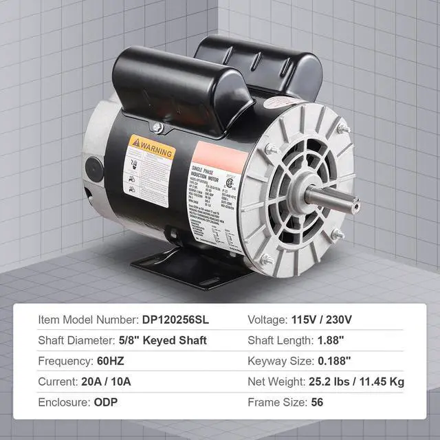 Shaft Length: 1.88",SF: 1.0,Voltage: 115V / 230V,Item Model Number: DP120256SL,Frequency: 60HZ,Shaft Diameter: 5/8" Keyed Shaft,Enclosure: ODP,Current: 20 A / 10 A,Net Weight: 25.2 lbs / 11.45 kg,Keyway Size: 0.188",Frame Size: 56