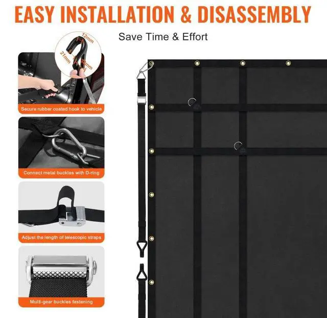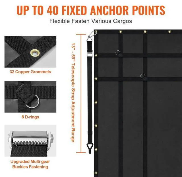 Adjustable Strap Size: 13 - 59 in / 330 - 1500 mm,Waterproof: Yes,Carabiner Size: 3.9 x 1.9 in / 99 x 47 mm,Max Tensile Capacity of Net: 700 lbs / 318 kg,Item Model Number: VCCN0072,Product Weight: 9.5 lbs / 4.3 kg,Material: PVC Coated Fabric + PP Webbing + Copper Grommets 32 pcs + Stainless Steel D-rings 8 pcs,Cargo Net Size: 72 x 57 in / 1830 x 1450 mm,Product Dimensions: 72.2 x 57 x 0.3 in / 1835 x 1450 x 7 mm (Fully Expanded)