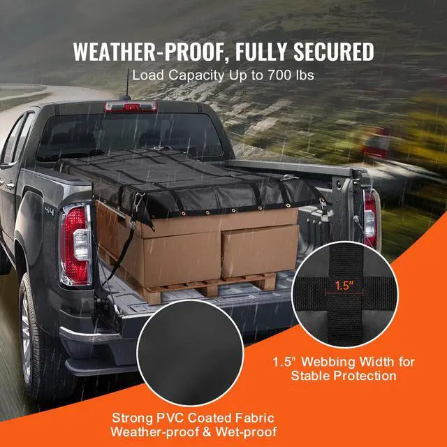 Adjustable Strap Size: 13 - 59 in / 330 - 1500 mm,Waterproof: Yes,Carabiner Size: 3.9 x 1.9 in / 99 x 47 mm,Max Tensile Capacity of Net: 700 lbs / 318 kg,Item Model Number: VCCN0072,Product Weight: 9.5 lbs / 4.3 kg,Material: PVC Coated Fabric + PP Webbing + Copper Grommets 32 pcs + Stainless Steel D-rings 8 pcs,Cargo Net Size: 72 x 57 in / 1830 x 1450 mm,Product Dimensions: 72.2 x 57 x 0.3 in / 1835 x 1450 x 7 mm (Fully Expanded)