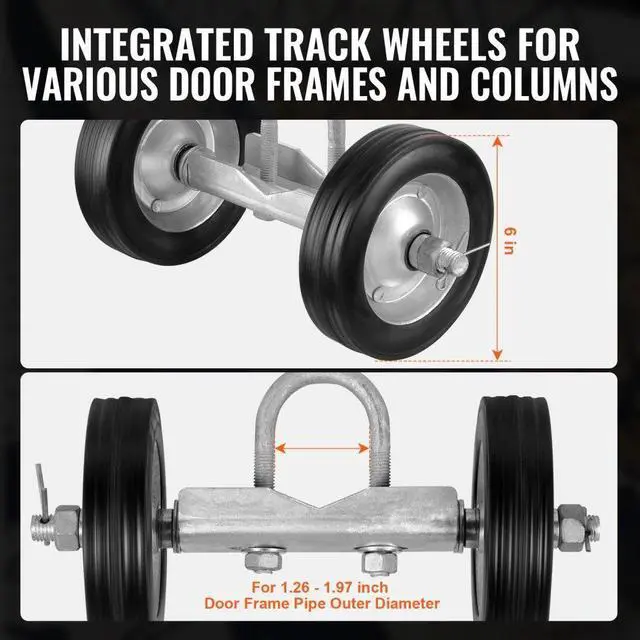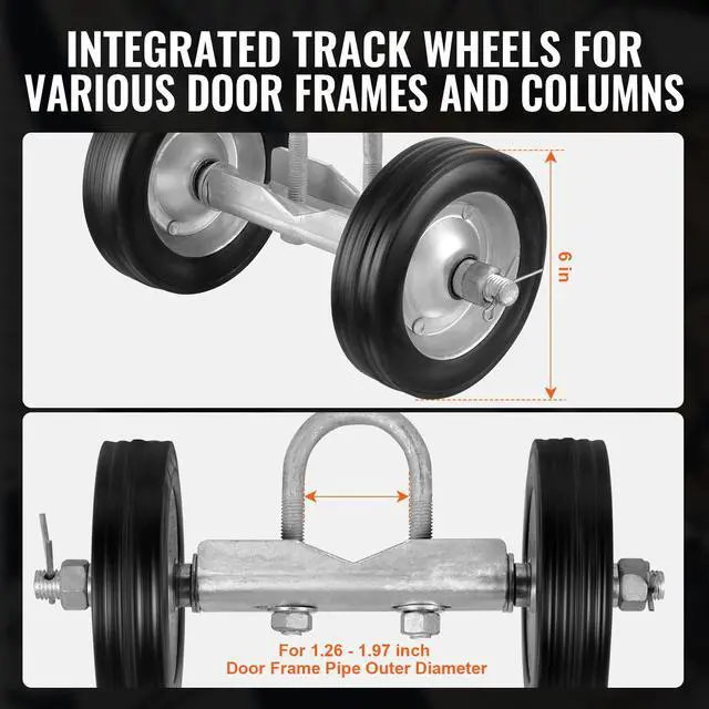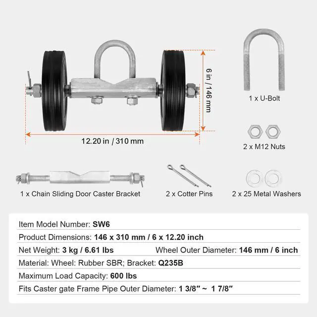 Wheel Outer Diameter: 146 mm / 5.75 inch,Materials: Wheel - SBR Rubber; Bracket - Q235B Steel,Item Model Number: SW6,Maximum Load Capacity: 600 lbs,Product Dimensions: 146×310 mm / 5.75×12.20 inch,Net Weight: 3 kg / 6.61 lbs,Compatible Door Frame Pipe Outer Diameter: 32-50mm / 1.26-1.97inch