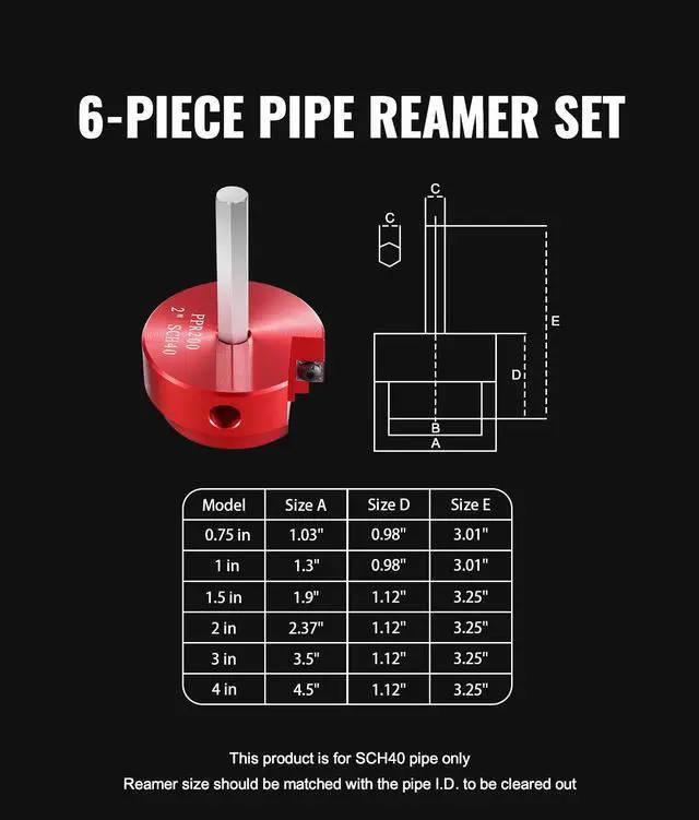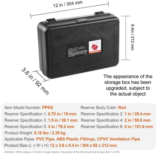 Blade Material: Tungsten Steel GU20+,Reamer Specification 5: 3 in/76.2 mm,Reamer Specification 6: 4 in/101.6 mm,Reamer Body Material: Aluminum Alloy 6061,Reamer Specification 1: 0.75 in/19 mm,Reamer Specification 2: 1 in/25.4 mm,Reamer Specification 3: 1 in/38.1 mm,Reamer Specification 4: 2 in/50.8 mm,Product Size: 12 x 3.6 x 8.4 in/304 x 92 x 212 mm,Reamer Body Color: Red,Applicable Pipes: PVC Pipes, ABS Plastic Fittings, CPVC Ventilation Pipes,Item Model Number: PPK6,Handle Material: Carbon Steel 45#