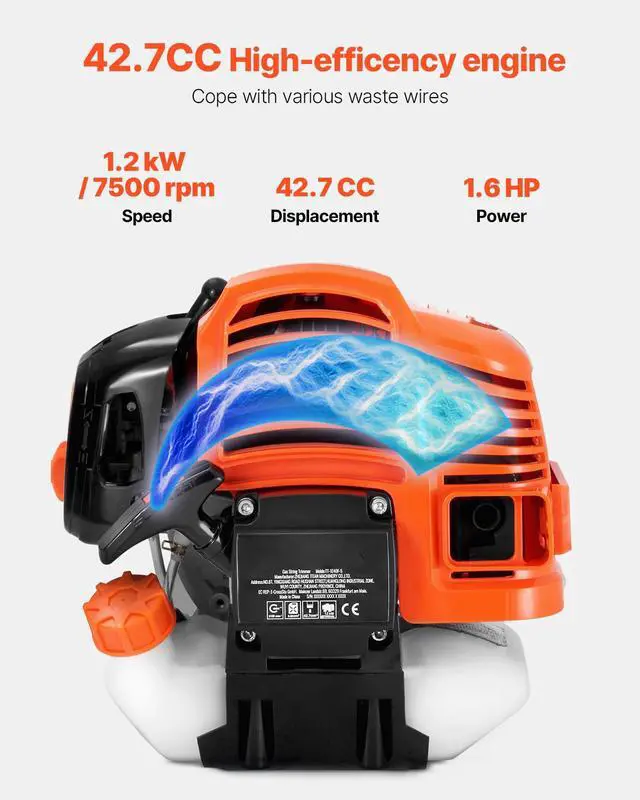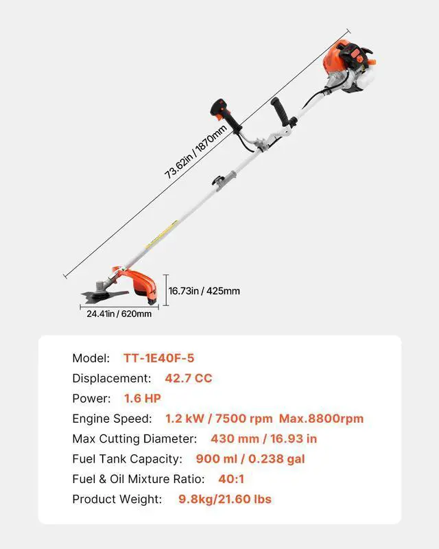 Dimensions (L x W x H): 1870 x 620 x 425mm/ 73.62 x 24.41 x 16.73 in,Max Cutting Diameter: 430 mm / 16.93 in,Engine Speed: 1.2 kw / 7500 rpm; Max. 8800 rpm,Fuel & Oil Mixture Ratio: 40:1,Item Model Number: TT-1E40F-5,Product Weight: 9.8 kg / 21.60 lbs,Fuel Tank Capacity: 900 ml / 0.238 gal,Displacement: 42.7 CC,Power: 1.6 HP