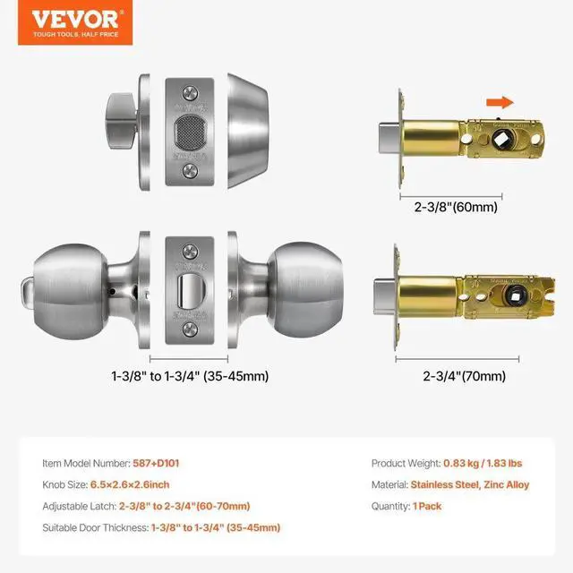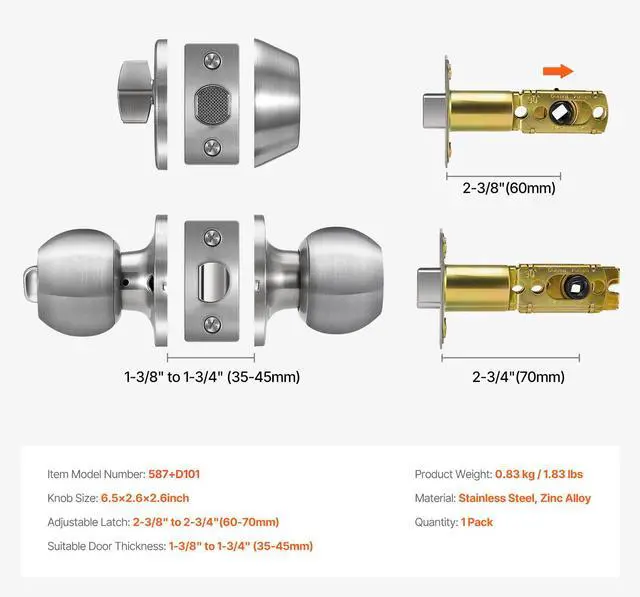 Latch Size: 2-3/8" to 2-3/4"(60-70mm),Suitable Door Thickness: 1-3/8" to 1-3/4" (35-45mm),Item Model Number: 587+D101,Product Weight: 0.83 kg / 1.83 lbs,Quantity: 1 Pack,Material: Stainless Steel, Zinc Alloy,Knob Size: 2.6 inch